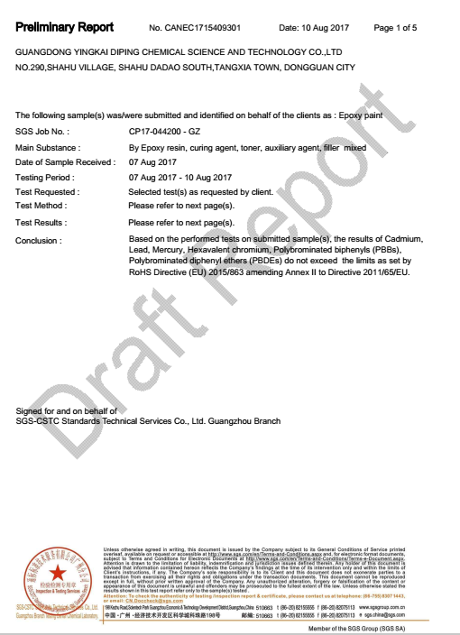 盈凱地坪(品牌:盈爾澳)是地坪漆行業(yè)知名地坪涂料生產(chǎn)企業(yè),每年都會對地坪漆、固化劑、罩光等一系列產(chǎn)品進行檢測,符合國際出口標準。